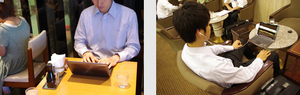 打ち合わせの合間には映画や音楽でリラックス。「フルハイビジョン液晶パネルで画像もきれいで、音もいいから映画なども迫力十分に楽しめます。これだけ再生してもバッテリーが長持ちするのでびっくりしました。」