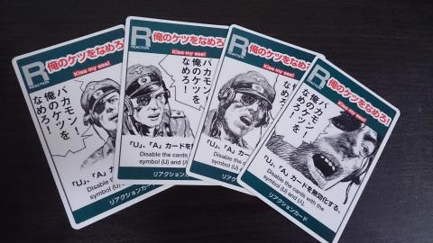 Rリアクションカード…他プレイヤーがAカードもしくはUカードを使用してきた時に使うカード。「俺のケツをなめろ!」カードもここに含まれる。