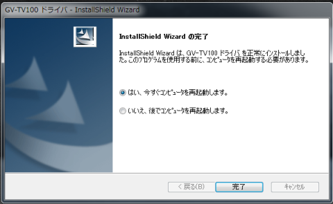 数分で再起動を促すウィンドウが開きますので、【完了】を押してインストール完了です。