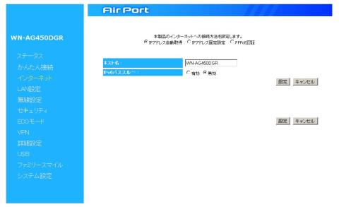 インターネット接続方法 IPアドレス自動取得、PPPoE認証(2セッション)、IPアドレス固定