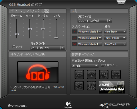 次はG35の設定です。ボリュームの調整、Gキーの設定、音声モーフィングの設定が行えます。