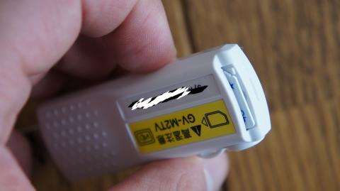 まるでUSBメモリのようにシンプル小さい。サイズは7.5cm程度。持ちやすいようにグリップ、持ち運びを想定してストラップが付けられるように工夫されている。側面には「miniB-CAS」が装着できるよう小さい差し込み口が・・・