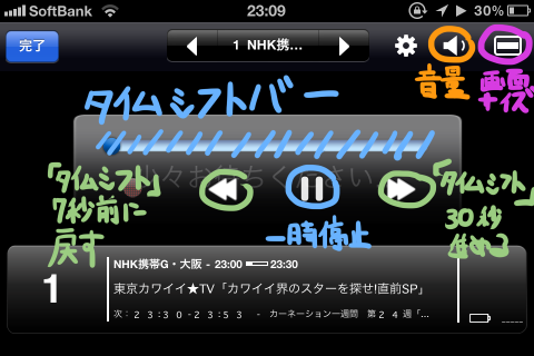 またタイムシフト機能と言う機能があり、画面に表示されるバーを左に操作をすると初期設定では最大5分前の内容まで見ることができます。