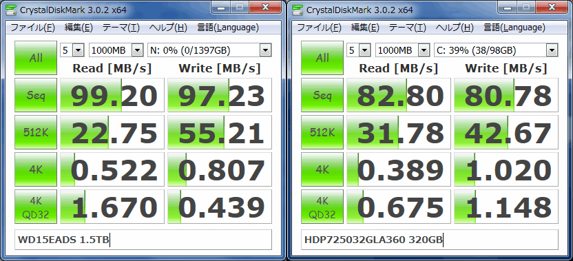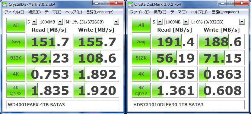 もう1台7K1000.D 1TBを買ってきました。何気にまだ名前がHITACHI時代の生産品だが、新品同士のぶつかり合い。1TBプラッタの恩恵で特にシーケンシャルの速度に優れ、生易しい相手ではない。
