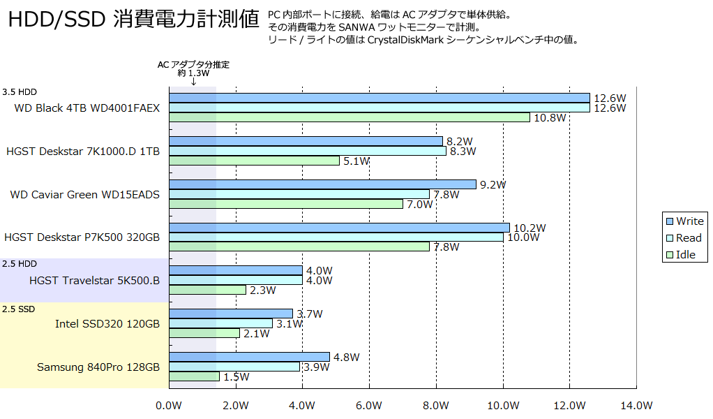 ちなみに計測に使用したACアダプタは何も接続していない時でも1.3~1.4W程度の電力を消費するのでその分多い値になっている点、HDDはスピンアップ(電源投入時など)に最も多くの電力を消費するので「最大消費電力」では無いことに注意。