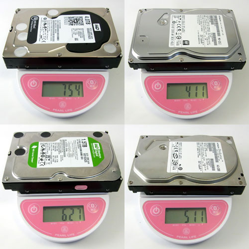 1枚プラッタの7K1000.D 1TBが411g、2枚プラッタのP7K500 320GBが511g、3枚プラッタのCaviar Green 1.5TBが627g。そしてWD4001FAEXが754g。