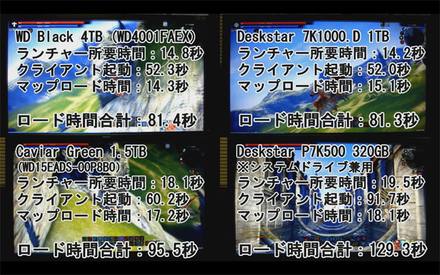 今回はベンチ編と同じ4台のHDDにTERAのクライアントを丸ごと複製。事前にデフラグをかけてからゲーム起動・都市間移動・転送時ロード等を確認していく。当然OS起動後初回の起動が一番時間がかかるので、1台のHDDを撮影する毎にOS自体を再起動した。