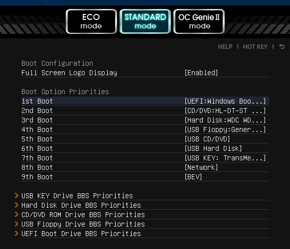 ここで注意するべきはマザーボードのブート設定。ブータブルメディアを入れた状態でブート項目を見ると「CD/DVD:HL-DT~(光学ドライブ名)」と「UEFI:HL-DT~」と同じ光学ドライブが2つ認識される。ここで後者を選ばないと従来型のブートになってしまうのでやっぱりGPTへの移行ができない。