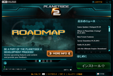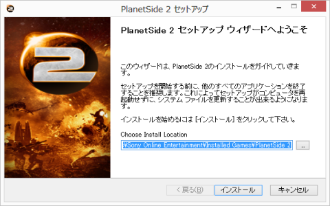Planetside 2の公式サイト(PlanetSide 2 PC Game - Massive Combat on an Epic Scale)からセットアッププログラムをダウンロードします。現在はトップページの左下(Download the Game)またはPLAY FREE(ログインしていない場合はアカウント作成ページに移動します)からダウンロードできます。またSteam(Steam へようこそ)に登録されているのでそちらでインストールを行う事もできます。
