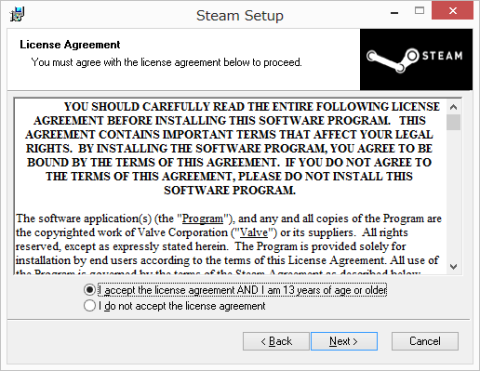 ※プレイにはSteam アカウントの登録(無料)と、Dota 2の有効化が必要です。Dota 2は無料でプレイが可能になる予定のゲームですが、完全版がリリースされるまでは「早期アクセスパックを購入」「応募して招待される」「他のプレイヤーからギフトを購入または貰う」等で有効化する必要があります。Steamの公式サイト(Steam へようこそ)で右上の「Steamをインストール」を押してその先の「今すぐ Steam をインストール」を押してSteamのクライアントをダウンロード、実行します。Steam Setupが起動するので確認しながら「Next」を押して進めていきます。「Install」を押すとインストールを開始します。インストールが完了しました。「Finish」を押すとSteamが起動します。