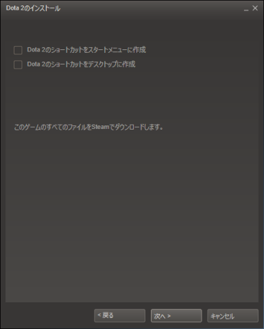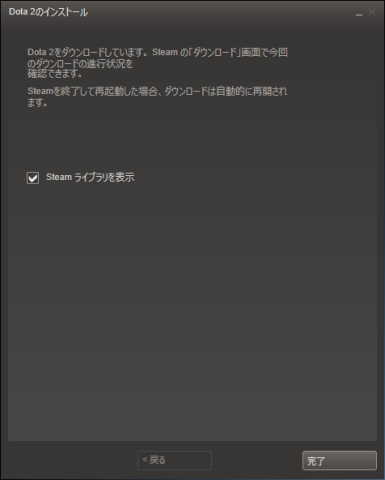 次はDota 2のインストールです。Dota 2を有効化してあるアカウントでログインしてライブラリでDota 2を選択、インストールを押します。確認画面がでるので「次へ」を押します。確認画面がでるので「次へ」を押します。「完了」を押したら終了です。あとはSteamを起動していると自動的にダウンロードとインストールが行われます。