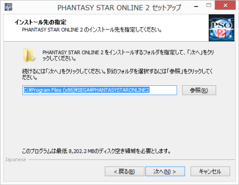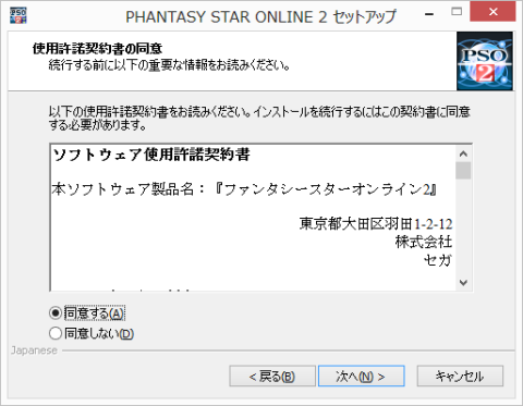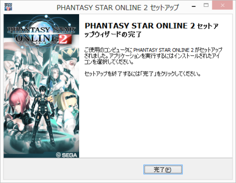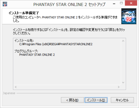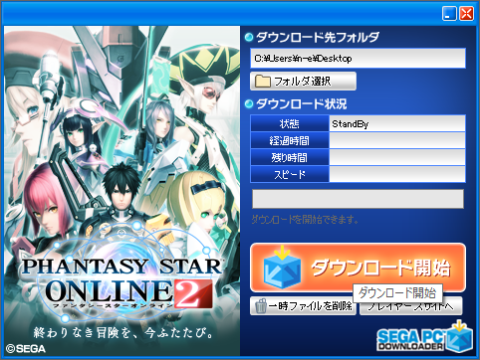 ※プレイするにはSEGA ID(無料)とDirectXをインストールする必要があります。トップページの左下「ゲームダウンロード」プレイヤーズサイトの左側にある「無料ゲームダウンロード」を押します。ゲームダウンロードのページで「ゲームダウンロード」を押してダウンロード、実行します。ダウンローダーが起動するので「ダウンロード開始」を押します。※初期設定だとデスクトップにダウンロードされます。ダウンロードが完了するとダイアログが表示されるので「はい」を選択します。PHANTASY STAR ONLINE 2 セットアップが起動します。「次へ」を押して進めていきます。インストール先を指定して「次へ」を押します。作成する場所を指定して「次へ」を押します。「インストール」を押してインストールを開始します。「完了」を押してセットアップを終了します。