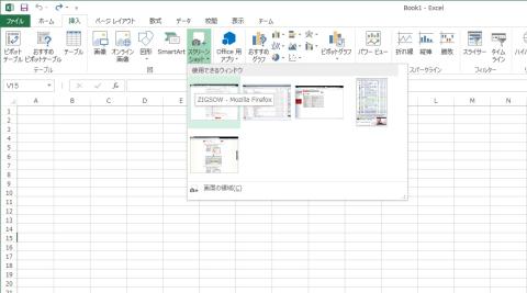 挿入メニューからスクリーンショットを選択すると対象となるWindowが表示されます。対象となるのは現在Window表示されている物。最小化している物は対象外です。