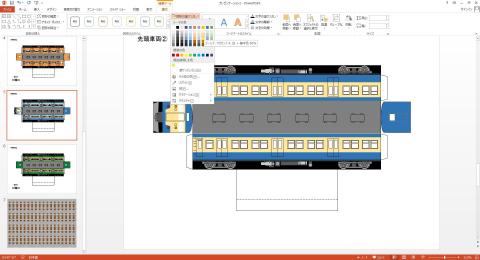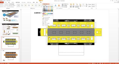 車両の色を変えるのは簡単。朱色の場所を選択してから、書式メニューの図形の塗りつぶしで。黄色を選びます。黄色1号のカラーコードがわからないので、とりあえず、近そうな黄色を作って載せてみました。