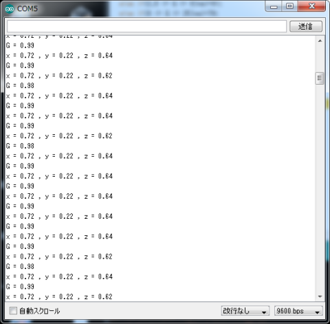画像のように、センサーからの生データと、Gに変換したデータがどんどん表示されます。