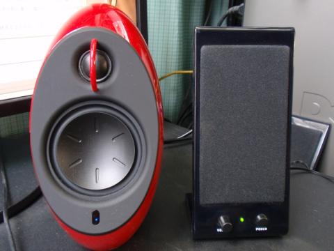 これでもパソコンの操作上必要な効果音の確認には十分なのですが、さすがに音楽を楽しむのには役者不足、て感じるんですよね。重低音は出ませんし、ところどころ割れるし、ボリュームもあまり上がらないし。だから音楽を聴くときにはミニコンポ(10年以上前の)にステレオジャックで繋いで聴いていました。
