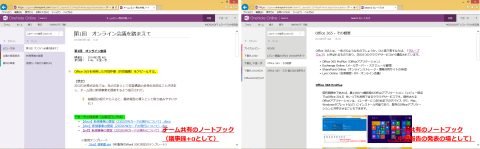 ニュースフィードは、特に説明はいりませんよね。チーム共有のノートブックは、クラウド上に置かれたホワイトボードを想像してください。書き込まれた内容がそのままチームの共有情報として蓄積できます。チーム3の場合は「議事録+α」として使ったり、「中間報告の発表の場」として活用しました。どちらの機能も、時間や場所を問わず、メンバー各自がアイデアや意見などを自由に書き込むことができ、会議を繰り返せない状況で効果的な手段であったと思います(レビュー期間が年度末であったうえ、消費税対策も重なり、メンバー全員が一堂に会することが困難でした)。