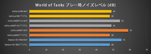 660TiのSLIでは、WoTがSLIに対応していないためそれぞれのカードが50%ずつの分担で描画していると思われるため、温度が低く抑えられた結果騒音も少なくなっています。