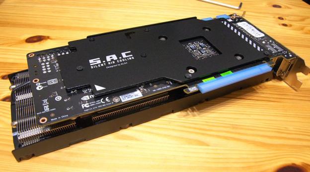 ビデオカードはS.A.Cと名付けられた独自クーラーが全面を覆っている構造となっており、ヒートシンクの上には3連のファンが取り付けられています。