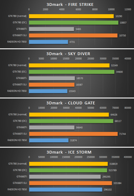 さて、スコアは…というと、GTX780は標準、OC共に似たような傾向で、他のスコアもほぼFIRE STRIKEと似ています。