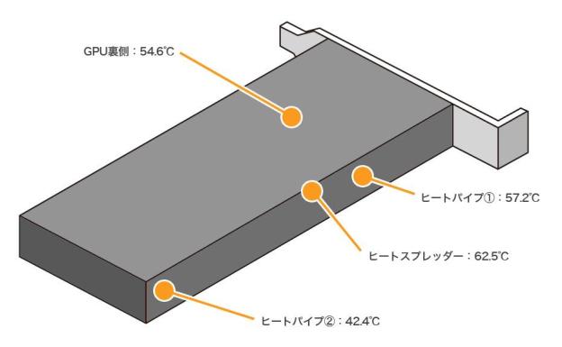 GPUの裏側を測定することでGPU周辺の温度を、2カ所のヒートパイプの温度を調べることでヒートパイプ末端まで熱が伝わっているかを、ヒートスプレッダーがきちんと冷却されているかを確認することとしました。