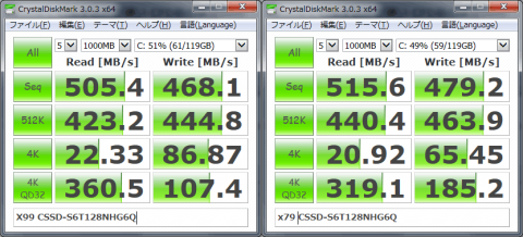 今回はシステムドライブとして使用した東芝製SSD(128GB)をシステム状態のままX79とX99でテスト。ご覧のとおりスコア差は…項目によって勝ったり負けたりバラバラ。システム状態のディスクなので他のソフトの挙動影響を受けやすいし、それまでX79に入れていたIRSTより、X99マザー付属のIRSTの方が古かったのでそのせいもあるかもしれない。