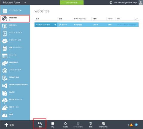 Azureの管理ポータル画面の左メニューより「WEBSITES」を選択し、右の画面の「CREATE A WEBSITES」をクリックします。