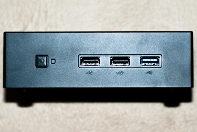 正面 左側より純に スイッチ、電源LED、USB2.0 x2、USB3.0 の各種端子。