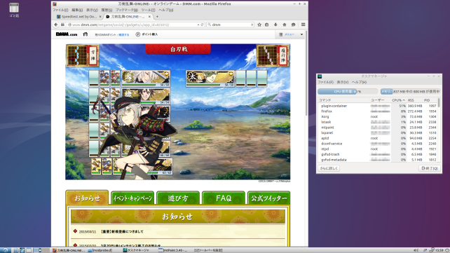 次はLubuntu 14.10 64bit desktop のFirefox上でも刀剣乱舞をプレイしてみようと企みました。