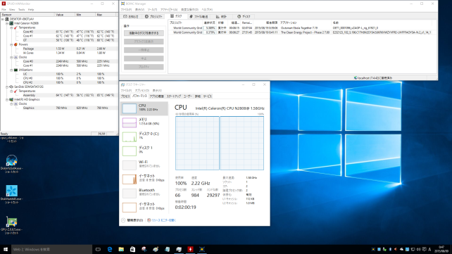 走らせるプロジェクトですが、まずは軽く WCGrid の Uncovering Genome Mysteries を走らせてみましょう。良い感じに処理されますね。CPUコア温度は高くても56℃前後の様です。