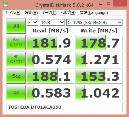 今回のレビュー商品にはHDDは東芝製の7,200rpmの高速タイプ 500GBモデルであるDT01ACA050が搭載されていた。