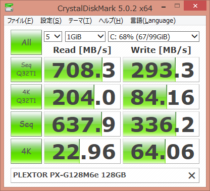 試しに、手持ちのPlextor製のM.2用PCI-E接続SSD、PX-G128M6e 128GBを使った場合と比較を行ってみたのが、上記のグラフである。