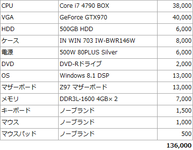 Lev-R007-i7-TM-WoTで使われているパーツをアキバで購入した場合のシミュレーションを行ったところ、136,000円という結果となった。