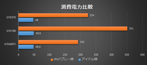 特に、ゲームプレー時でも224W、アイドル時は48Wという低消費電力はアイドル300W、ゲーム時450WというメインPCを使っていると、とても素晴らしい数値である。