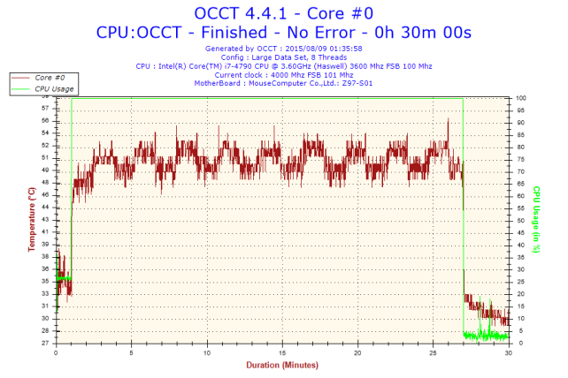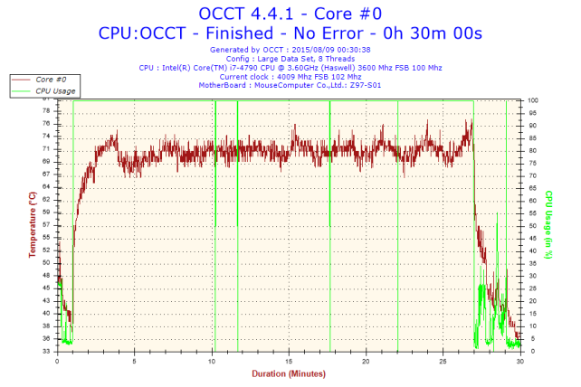 Haswell世代のCPUでは、個人的には4GHを越え、4.4GHzあたりまでクロックを伸ばすと急激に発熱が増える印象があるため、通常3.6GHz、ターボブースト利用時でも4GHzというクロックは発熱と処理速度のバランスが良いのかもしれない。