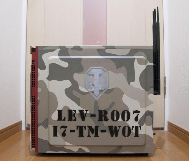 ケース側面には3Mダイノックシートを切り抜いて作ったWorld of Tanksのロゴと、適当やっつけステンシルで書いたPCの型番を入れてみた。