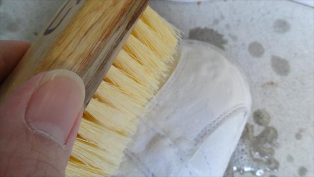 同じようにブラシに水をつけて、シュークリーナーをブラシに数滴落として、再びブラシに水を少しだけつけて擦る!が、帆布がガッツリ水気を吸ってしまって泡立たないʕ→ᴥ←ʔ