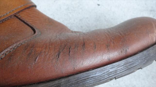これは乾燥によるクラックでしょうか。蚤の市で売られてたブーツなので、おそらく管理が行き届いてなかったものと思われます。