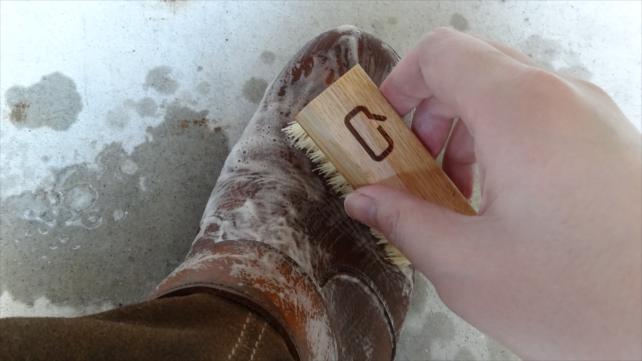 こちらもスニーカーのように、泡立ててゴシゴシ洗います。ブラシの先が靴墨の茶色に染まりましたが、すぐに水洗いすれば簡単に落ちました。なのでちゃんとブラシを洗えば、スニーカーなどに色移りすることはないと思います。