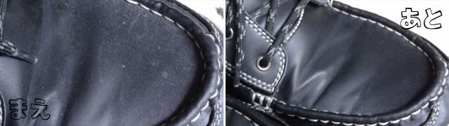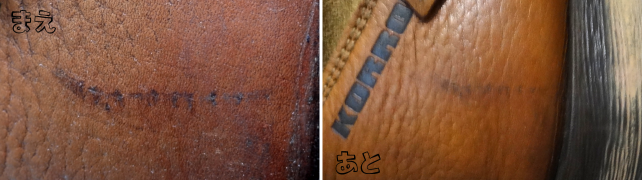 こちらは若干綺麗になった気がしますが、やはりクラックの奥に染み込んだような汚れまでは落ちなかったみたいです。でもまあ、これもひっかき傷の方もミンクオイルとかでケアしてブラウン系の靴墨を塗り込めば、パッと見では目立たないのではないかと思います。
