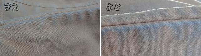 もともとそれほど汚れはなかったので写真では違いが分かりづらいですが、縫い目の隙間に詰まった微小な汚れは綺麗に落ちました。また、内側の右側がカビっぽいものに少し浸食されているようでしたが、こちらはやはり落ちませんでした。繊維の奥深くに入り込んでいる染料やカビの汚れまでは落とせないようです。