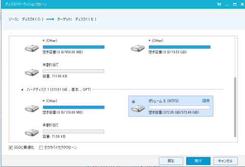 ソースのディスクを指定します。(当初SSDがAドライブとして認識されており上にあります。その後Eドライブに設定)