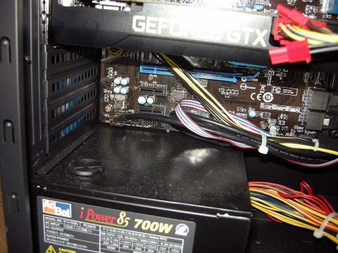 ケースを開けて(ネジを2本外してスライドさせるだけでした。)グラフィックカードの下に挿入します。しかし、写真の電源ケーブルがグラフィックカードとマザーボードの隙間を通過しており、一度、グラフィックカードを外さないといけません。配線をまとめるためにしたのだと思われます。