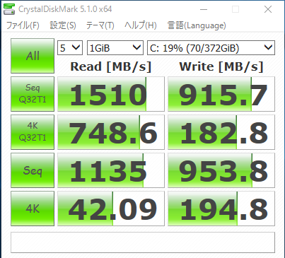少しですが、速度は上がっているようです。私の環境の場合、PCI Expreeスロット2つに対して、1つは「NVIDIA(R) GeForce GTX 970」を搭載しています。そのため、「インテル(R) SSD 750 シリーズ」の本来の速度が出ていません。しかし、この数値であれば問題ないと思います。