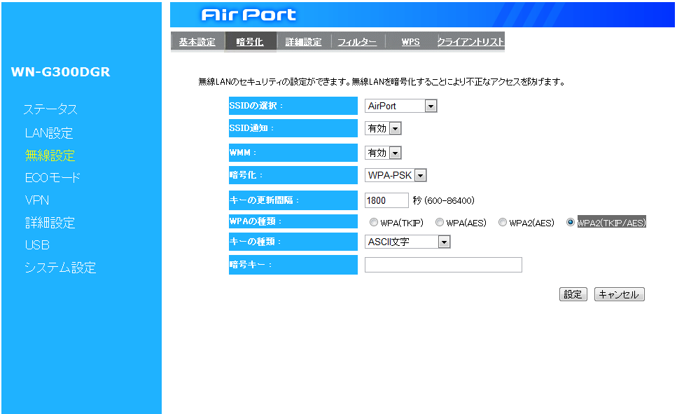 無線設定→暗号化で、WPAの種類を WPA2(AES)にして設定するだけでOKです。