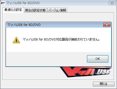 USB接続ドライブの転送速度を向上させるIO-DATAのマッハUSB機能を生かそうと、以前からインストール済みのマッハUSB for BD/DVD(IO-DATA製USB外付けBDドライブBRD-UH8LE付属)を起動したが、ドライブが接続されていて、使えているのに、