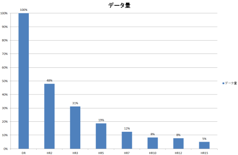 続いて、45分番組を録画モードごとのデータ量とDRモードを100%としたときの圧縮率です。