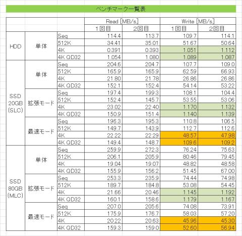 特に興味深いのは、ライト性能(最速モード)においてSSD 20GB(SLC)の結果を見ると、
