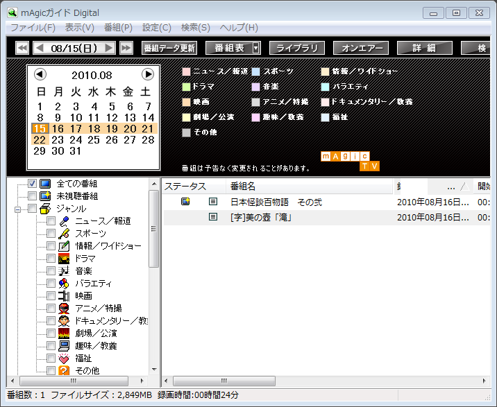 録画予約をしている時、PCでの視聴や再生のために「mAgic TV Digital」を起動すると著作権保護エラーが発生することがあるが、その際には本機をセットしたPCを録画専用として使用し、DLNA対応機器でDIXIM Media Server3を使って再生すると他のメディアにデータを移す手間も掛からない。