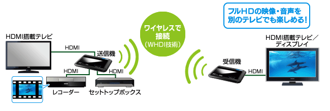 送信機には2つのHDMI入力端子があり、ブルーレイレコーダー、ハードディスクレコーダー、セットトップボックスなどの映像機器を好きな組み合わせで2台まで繋ぐことができる。視聴する機器は送信機で選択できるほか、付属のリモコンを使ってどちらの映像を見るか切り替えることが可能。